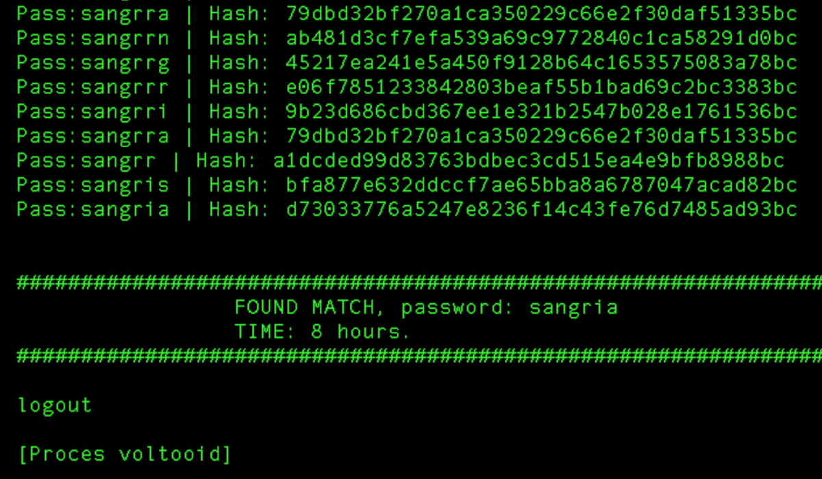 De tweede poging begon weer met alle karakters uit het alfabet (kleine letters, 26), maar dit keer met een maximale lengte van 7 karakters. Na maar liefst 8 uur non-stop wachtwoorden genereren kwam het goede nieuws; “Match found!”.