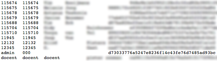 De gegevens van alle leerlingen zijn echter wel privacy gevoelig! In het wachtwoorden bestand stond de volledige naam, het leerlingnummer en de wachtwoord hash. Het wachtwoord heeft bij elke leerling 6 tekens en maakt gebruik van hoofdletters, wat zorgt voor 52^6 mogelijk combinaties. Het kraken van deze wachtwoorden zal beduidend meer tijd kosten, maar het is wel mogelijk.